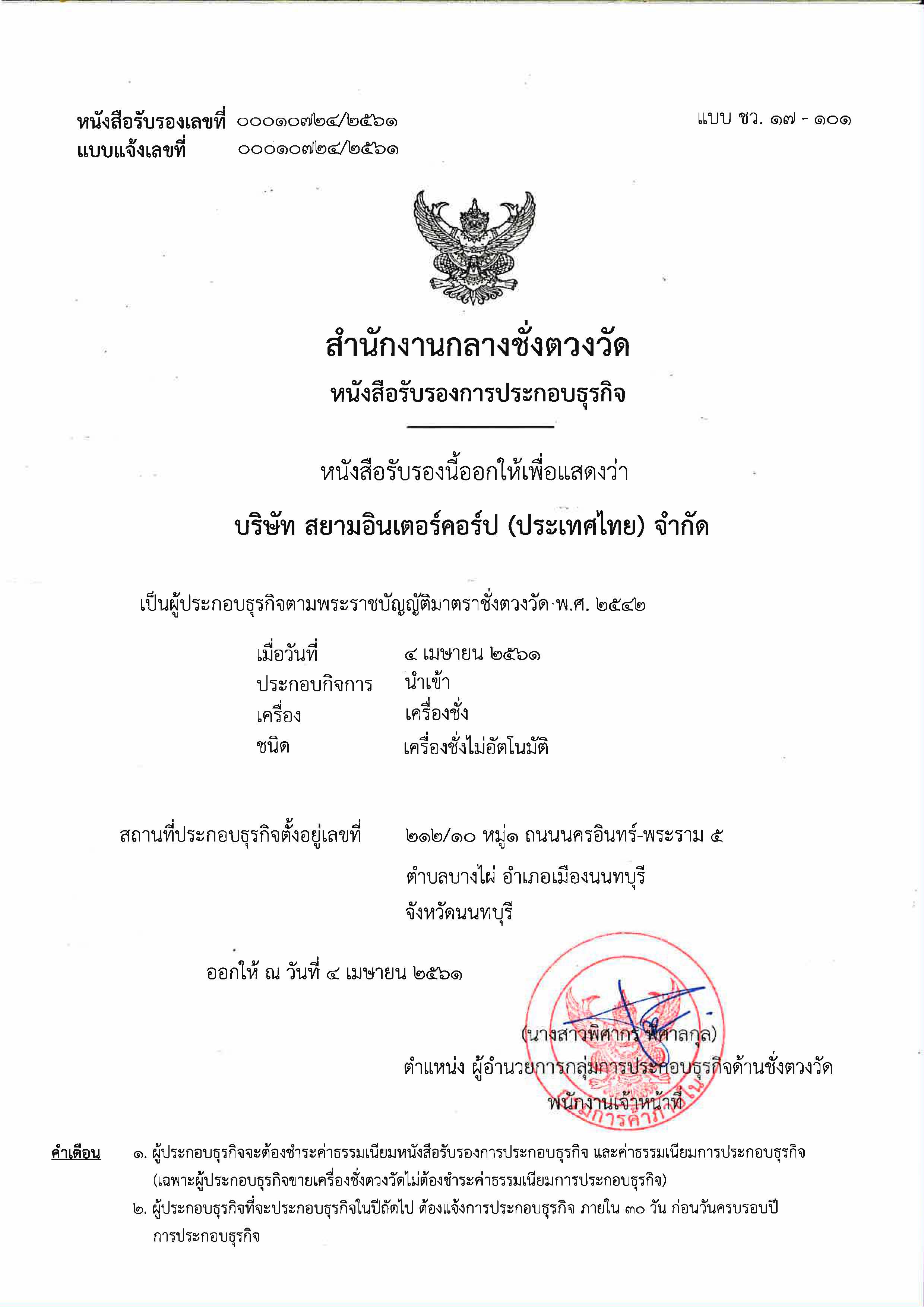 หนังสือรับรองการประกอบธุระกิจ นำเข้า และ ขาย