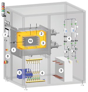 ![]() Schematic presentation of a cold-wall retort furnace with additional equipment 1 Retort 2 Heating 3 Insulation 4 Gas management system 5 Vacuum pump 6 Cooling water distribution 7 Controls 8 Integrated switchgear 9 Heating transformer 10 Charging frame inside the inner process chamber |