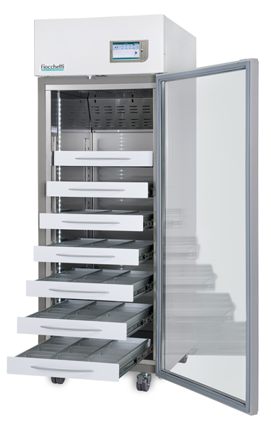 To comply with the most restrictive regulations, Fiocchetti’s Emoteca range offers the most comprehensive safety features for the storage of blood, blood-related products and donated breast milk. Emoteca series therefore features: Touch controller with temperature graph, an independent recording module "DMLP Touch", backup batteries for data recording and alarms messages during power failure events, external contacts for remote control+ Ethernet port, product temperature simulation probe, electric-digital lock for access control and extractable drawers with dividers for blood bags arrangement. Fiocchetti blood banks are Medical Devices complying with Directive 93/42/EEC (class IIa) and its amendment 2007/47/EEC and are registered in the MD Repertoire of the Italian Ministry of Health. They also comply with DIN 13277 and 2011/65/EC (RoHS)
