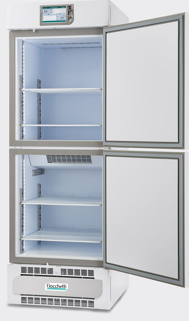 Combined refrigerator + freezer, certified for storing plasma, with two solid doors and double cooling unit, Touch screen display managing both chambers and data recording.